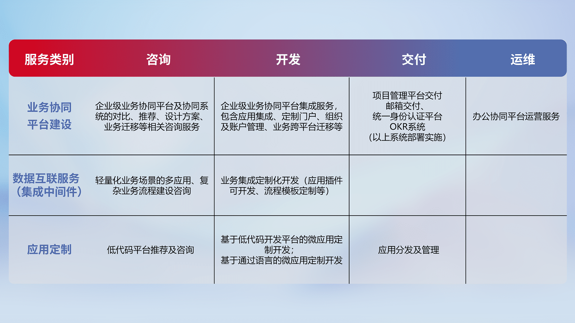 针对钉钉、、企微、、、、IDaas等平台级产品提供产品的规划、、、方案、、、交付、、、定制化开发等服务,,,,实现如统一协同办公、、智能客户服务、、混合会议管理、、、智能数据查询、、、等业务场景,,,,实现数字化转型。。。。